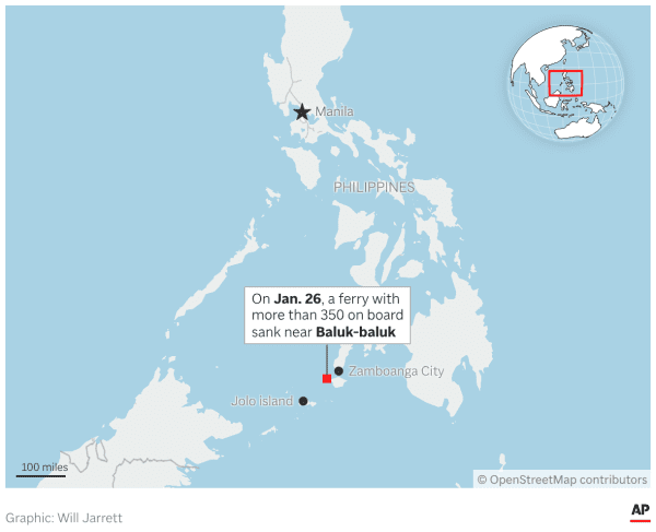 МАНИЛА, Филиппины (AP) — Паром с более чем 350 людьми на борту затонул рано утром в понедельник недалеко от острова на юге Филиппин, в результате чего погибли по меньшей мере 18 человек, сообщили официальные лица. Спасатели вытащили еще сотни человек, в то время как флот кораблей береговой охраны и военно-морского флота ведет поиски пропавших без вести.