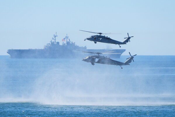 Морские пехотинцы проводят показательные выступления с вертолетами и десантным кораблем USS Boxer под наблюдением вице-президента Дж. Д. Вэнса (на фото не изображен) в честь предстоящего 250-летия Корпуса морской пехоты в субботу, 18 октября 2025 года, на базе морской пехоты Кэмп-Пендлтон в Кэмп-Пендлтоне, Калифорния. (Фото AP/Грегори Булл)