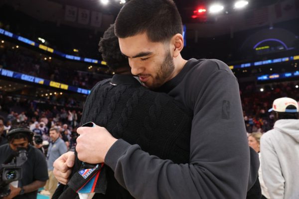 Зак Эдей №14 из команды «Мемфис Гриззлис» обнимает Джарена Джексона-младшего №20 из команды «Юта Джаз» после игры 20 февраля 2026 года в FedExForum в Мемфисе, штат Теннесси. Фото: Джо Мерфи/NBAE/Getty Images