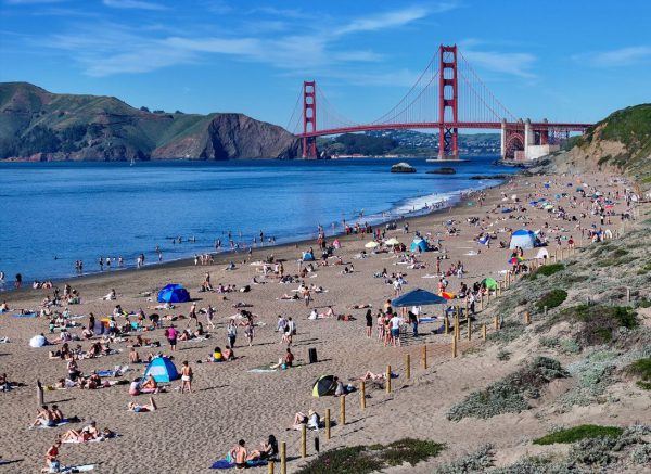 16 марта в Сан-Франциско, штат Калифорния, люди массово стекаются на пляж Бейкер-Бич возле моста Золотые Ворота, несмотря на предупреждение о жаре. Фото: Тайфун Кошкун/Anadolu/Getty Images. Жара и жара.