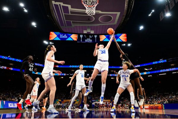 Анджела Дугали №32 из команды UCLA Bruins подбирает мяч в первой половине финального матча чемпионата NCAA по женскому баскетболу против команды South Carolina Gamecocks. Фото: Бен Соломон/NCAA Photos/Getty Images