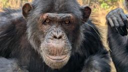 Вэл, взрослый самец шимпанзе, демонстрирующий жест «трава в ухе». Джейк Брукер/Фонд помощи сиротам-животным Chimfunshi.